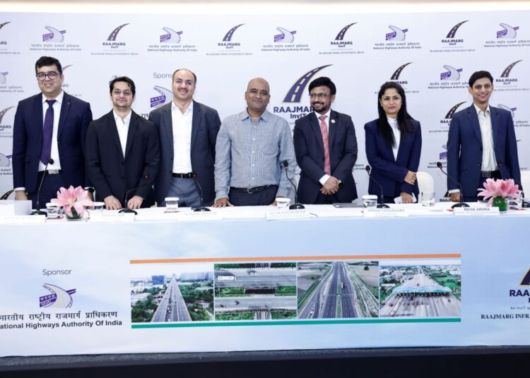 श्री एनआरव्हीव्हीएमके राजेंद्र कुमार, सदस्य वित्त, एनएचएआय आणि एमडी आणि सीईओ, राजमार्ग इन्फ्रा इन्व्हेस्टमेंट मॅनेजर्स प्रायव्हेट लिमिटेड (आरआयआयएमपीएल) मध्यभागी, डाव्या ते उजव्या बाजूला: संजय सेठिया (वरिष्ठ उपाध्यक्ष – डेट कॅपिटल मार्केट, एसबीआय कॅपिटल मार्केट्स लिमिटेड), आदित्य जैन (कार्यकारी संचालक, अॅक्सिस कॅपिटल लिमिटेड), मनीष त्रिवेदी (विकास संचालक, ट्रान्सलिंक इन्फ्रास्ट्रक्चर कन्सल्टंट्स प्रायव्हेट लिमिटेड), अर्णब चौधरी (ईव्हीपी आणि ग्रुप हेड – डीसीएम, एसबीआय कॅपिटल मार्केट्स लिमिटेड), रिचा अरोरा (व्यवसाय प्रमुख – पायाभूत सुविधा, रिअल इस्टेट आणि लार्ज कॉंग्लोमेरेट्स, आयसीआयसीआय सिक्युरिटीज लिमिटेड) आणि तन्मय जगदाळे (व्हीपी – ईसीएम, मोतीलाल ओसवाल इन्व्हेस्टमेंट अॅडव्हायझर्स लिमिटेड) हे पत्रकार परिषदेत राजमार्ग इन्फ्रा इन्व्हेस्टमेंट ट्रस्ट, एनएचएआय (नॅशनल हायवेज अथॉरिटी ऑफ इंडिया) द्वारे प्रायोजित इनव्हिटची घोषणा करण्यासाठी आयोजित पत्रकार परिषदेत उपस्थित होते.